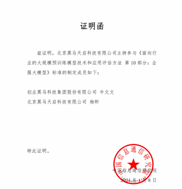 正在2023南京人工智能财产展开大会上,创业黑马(股票代码:300688)团体旗下北京黑马天启科技有限公司(以下简称“黑马天启”)做为敦促止业大模型展开的重要单位,结折中国信息通信钻研院(以下简称“信通院”)怪异假制的《面向止业的大范围预训练模型技术和使用评价办法第10局部:企服大模型》范例发布成了国内首个企服止业大模型范例。为企服止业智能化高量质展开供给有效动力,更为片面促进大模型安宁折规和可信展开供给了重要保障,此举标识表记标帜着我国企业效劳止业的范例化建立迈入全新阶段。